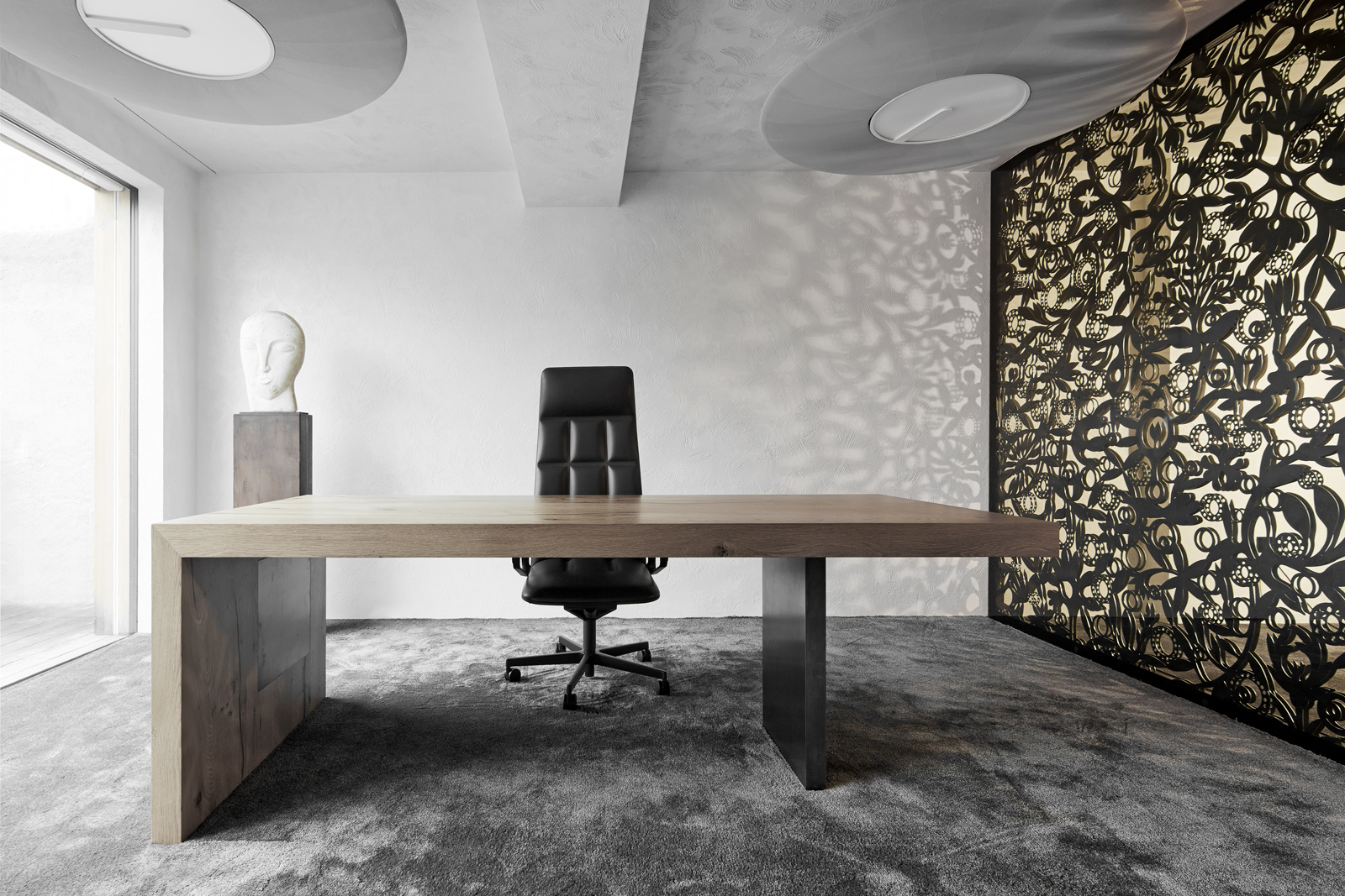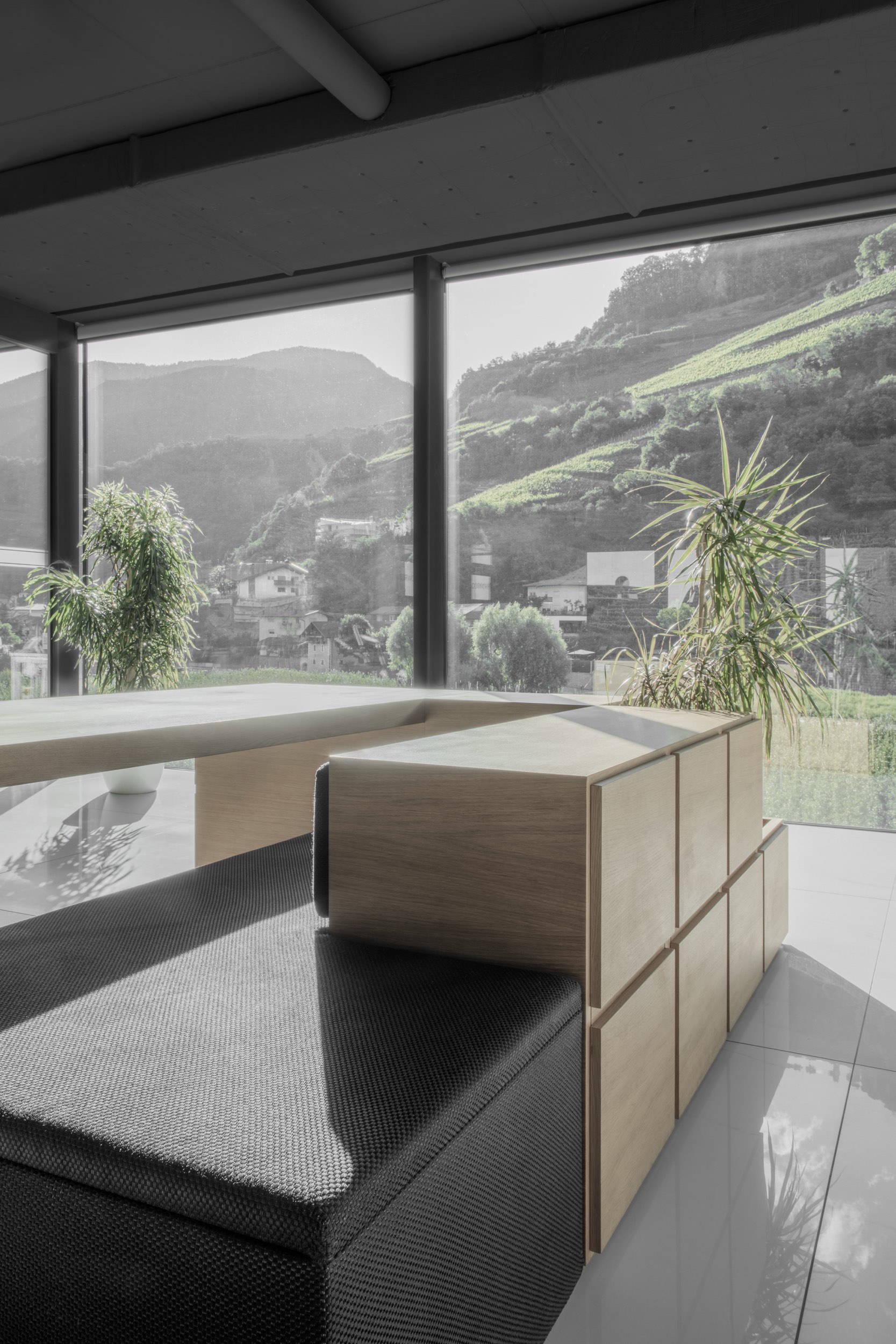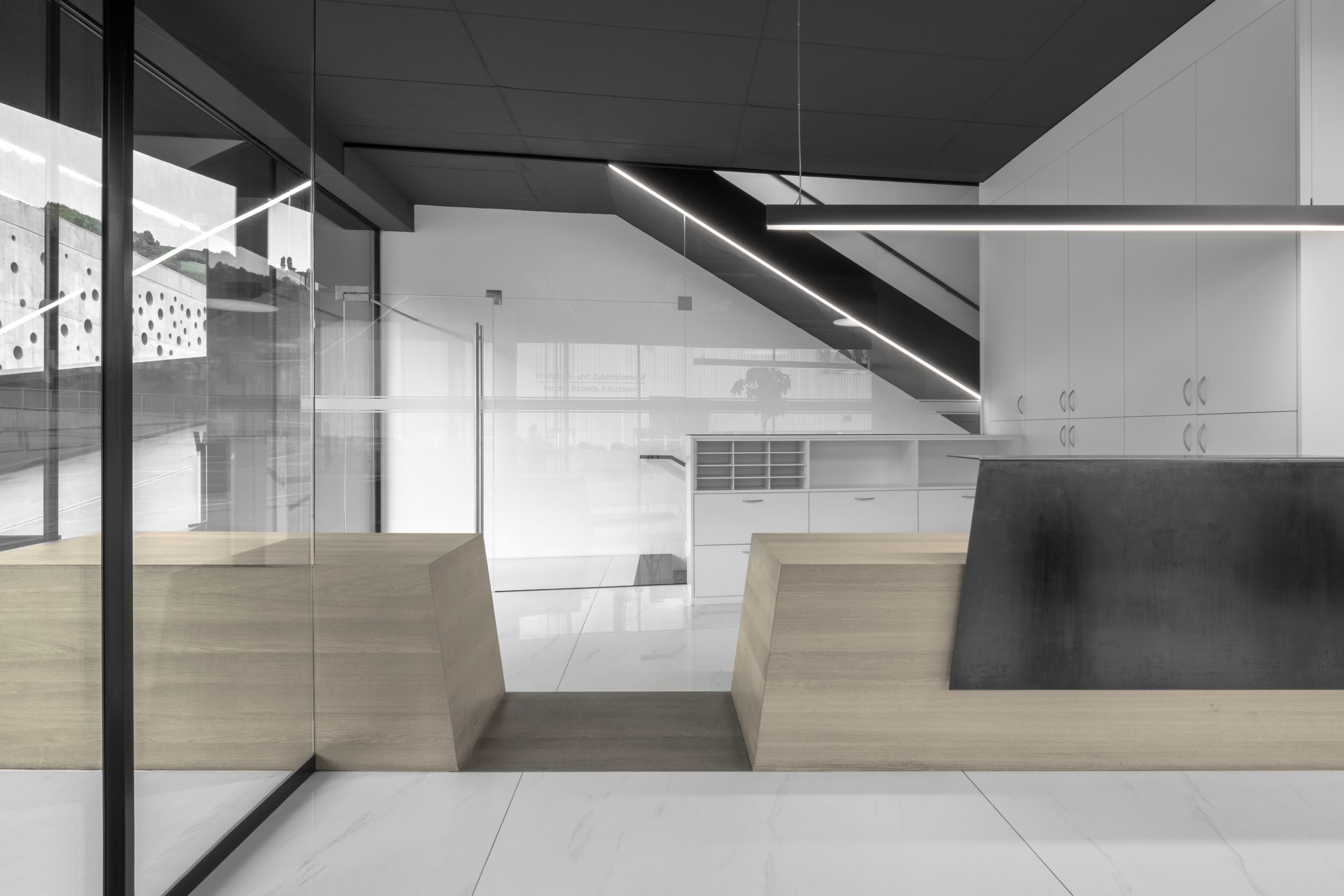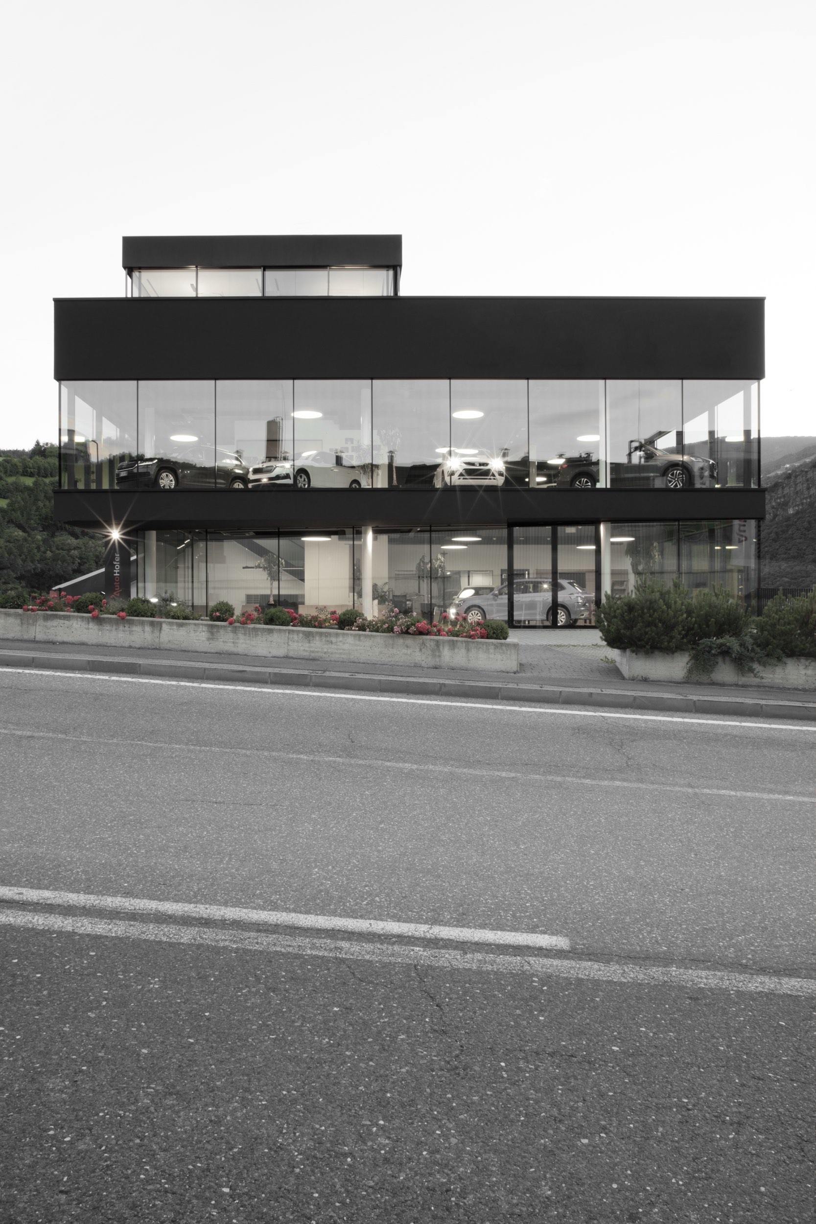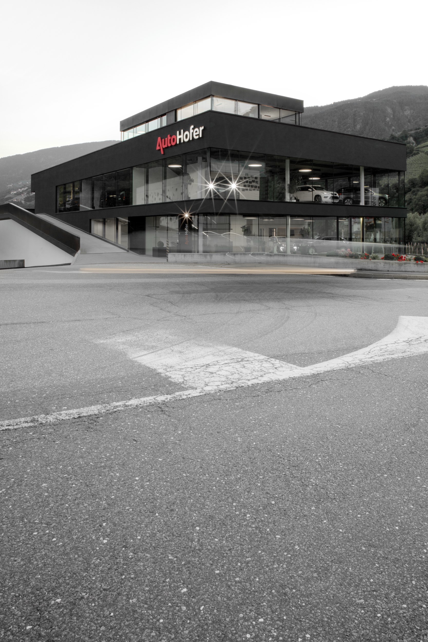 Mit einer Formsprache des Linearen und ganz in Schwarz zieht das Autohaus Hofer innerhalb des grauen Industriegebiets von Klausen die gewünschte Aufmerksamkeit auf sich. Über eine Reduktion auf das Wesentliche zielte das Projekt primär auf die Realisierung einer ästhetisch-funktionalen Verbindung der beiden Kernkompetenzen des Unternehmens als Fahrzeugverkaufs- und Servicebetrieb ab. Diese wurden über die Idee eines »Mantels« voneinander getrennt.