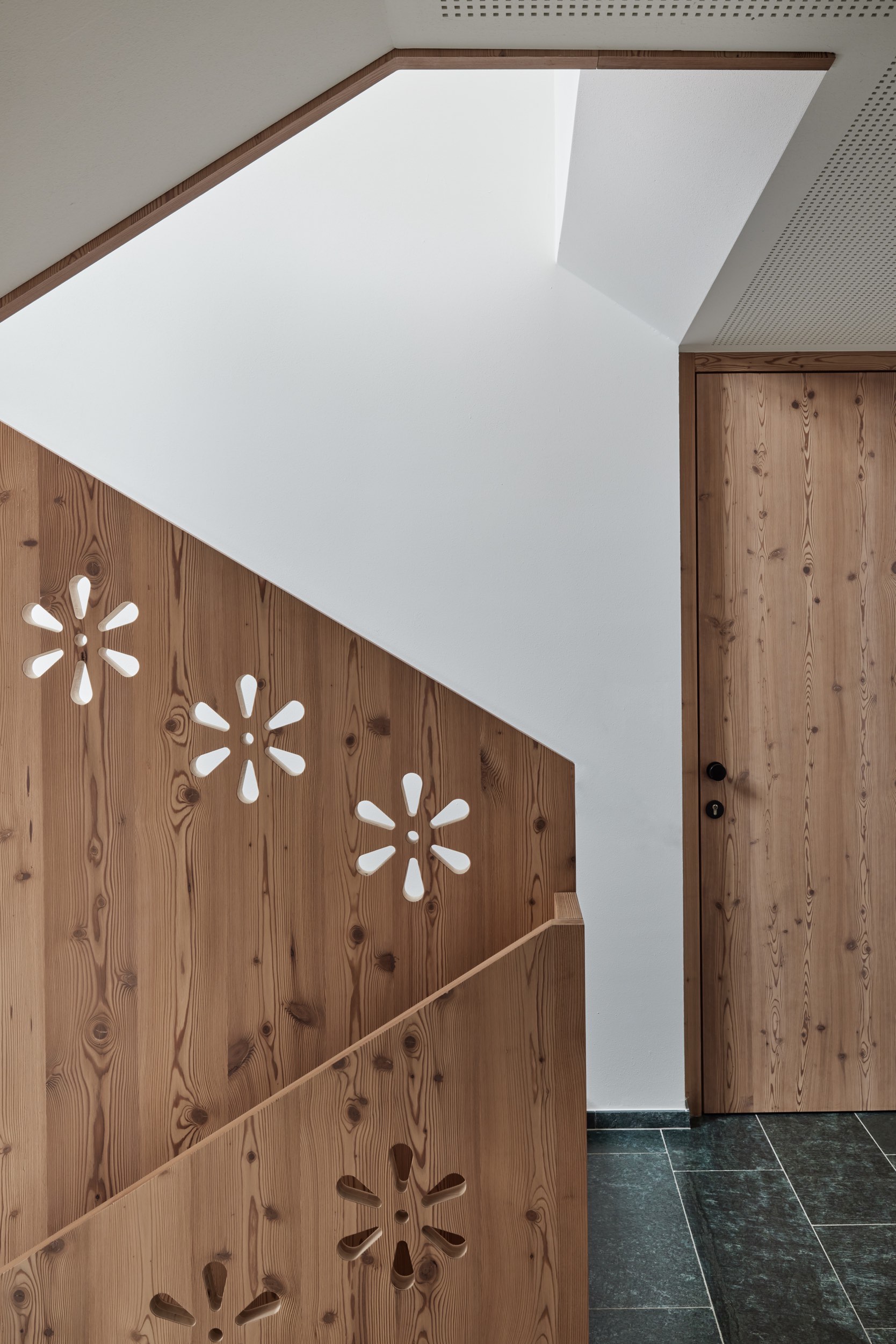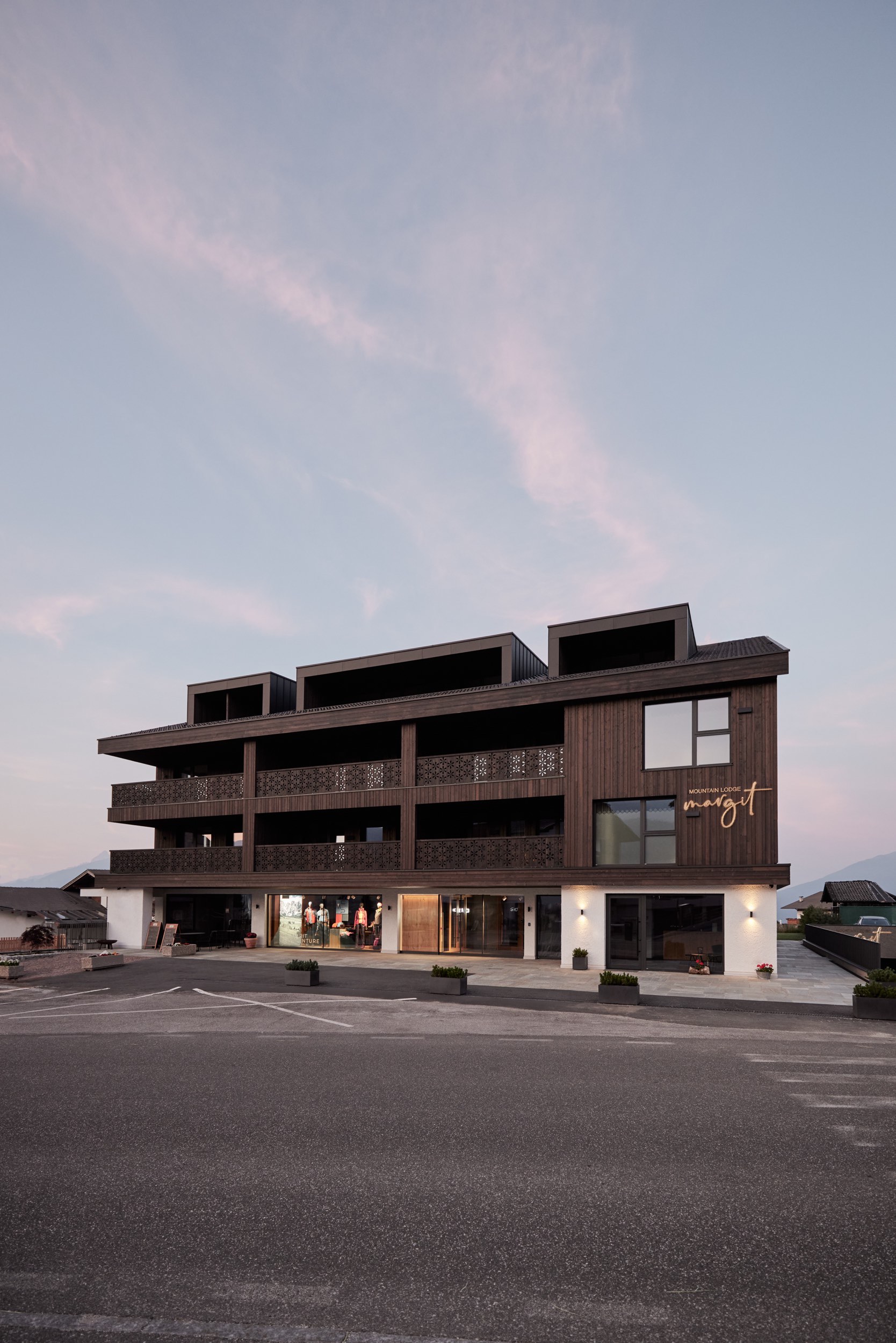 Der konsequente Einsatz von Margeritenornamenten im Außen- und Innenbereich ist eine Sympathiebekundung an die Inhaberin und Ortspersönlichkeit Margit. Wie die Fassade, stellt auch das Interior Design Bezüge zur bäuerlichen Lebenswelt her. Alle Ferienwohnungen sind mit einem türkisgrünen Kachelofen ausgestattet, der einen starken Kontrast zu Holzböden- wänden, -türen und -möbel bildet. Die schwarze Spachtelung der Kochnische erinnert an alte Rauchkuchln – eine Hommage an den ehemaligen Gasthof »Stubenruß«.
