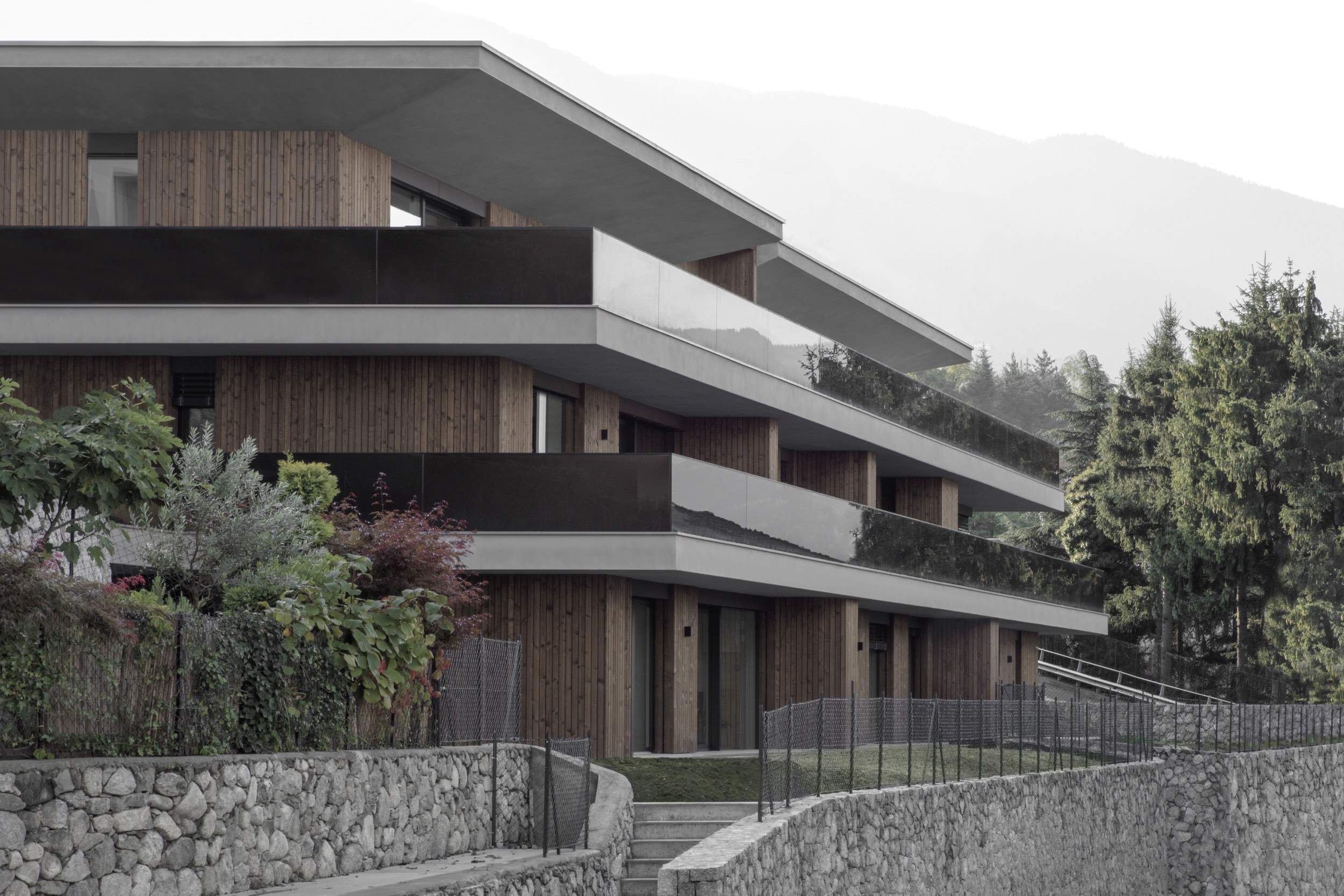 Steil ansteigende Weingärten – über regelmäßig gesetzte Linien aus stützenden Trockenmauern aus Stein durchbrochen – prägen das kulturlandschaftliche Bild der Weinregion Südtirol und inspirierten auch die Formsprache der Wohnanlage Pavillon, die an der Stelle eines ehemaligen Weinguts entstehen sollte.